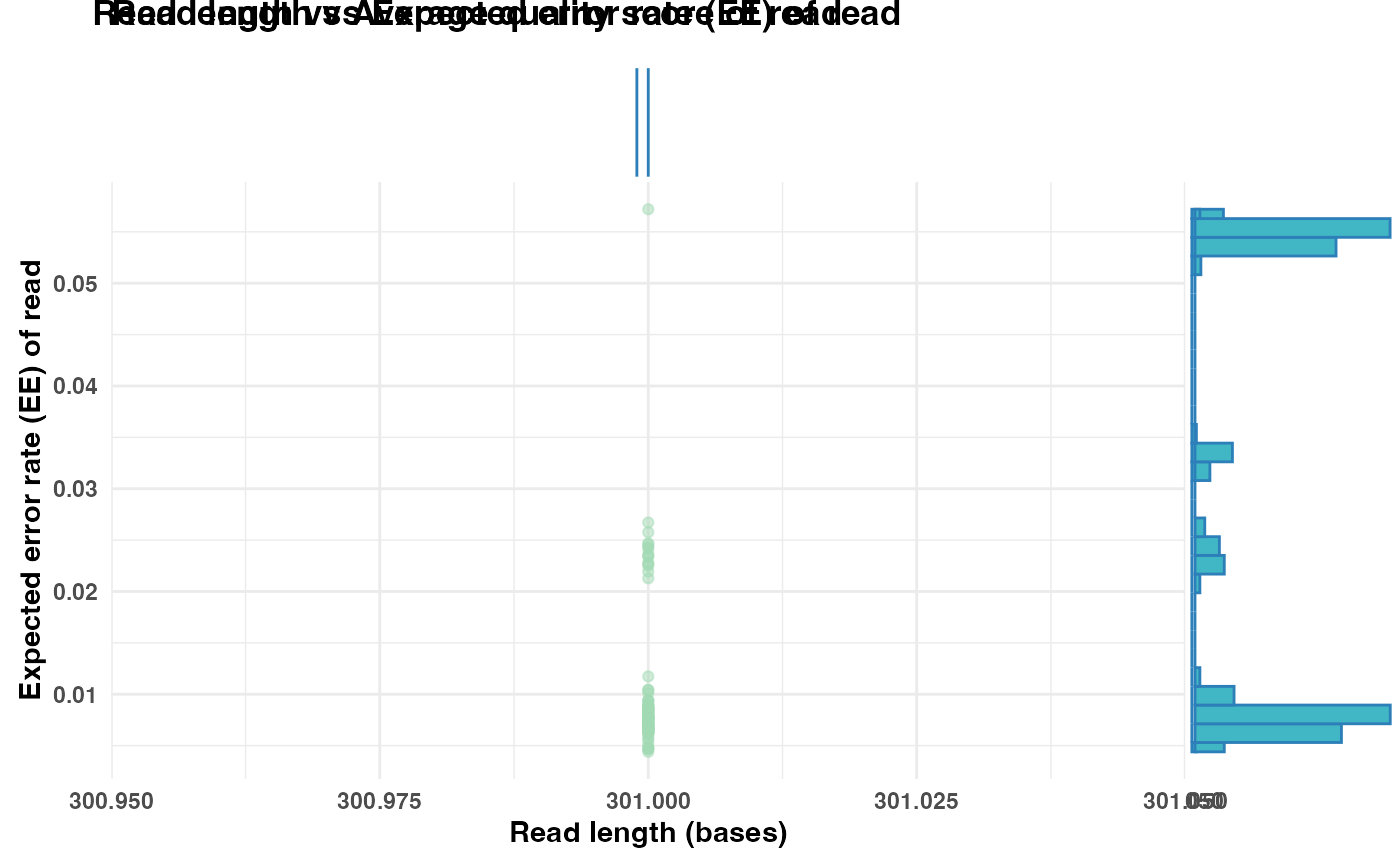 Generates a scatter plot visualizing the relationship between read length and read quality. The y-axis can display either the mean quality score per read or the expected error (EE) rate. Marginal histograms are included to show the distribution of read lengths and quality metrics.